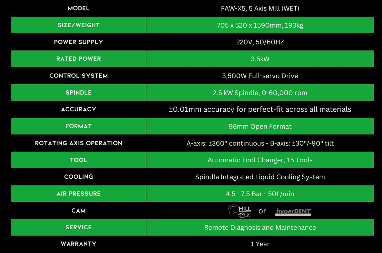 Built for industrial-grade production, the FAW X-5 (Wet) combines precision machining with clinical versatility. With a cast aluminum frame, 3.5 kW full-servo drive, and integrated water-cooling, it mills titanium abutments, glass ceramics, PMMA, and resins with ±0.02 mm accuracy. Its intelligent maintenance features and multi-axis articulation make it a durable, flexible solution for high-demand labs.