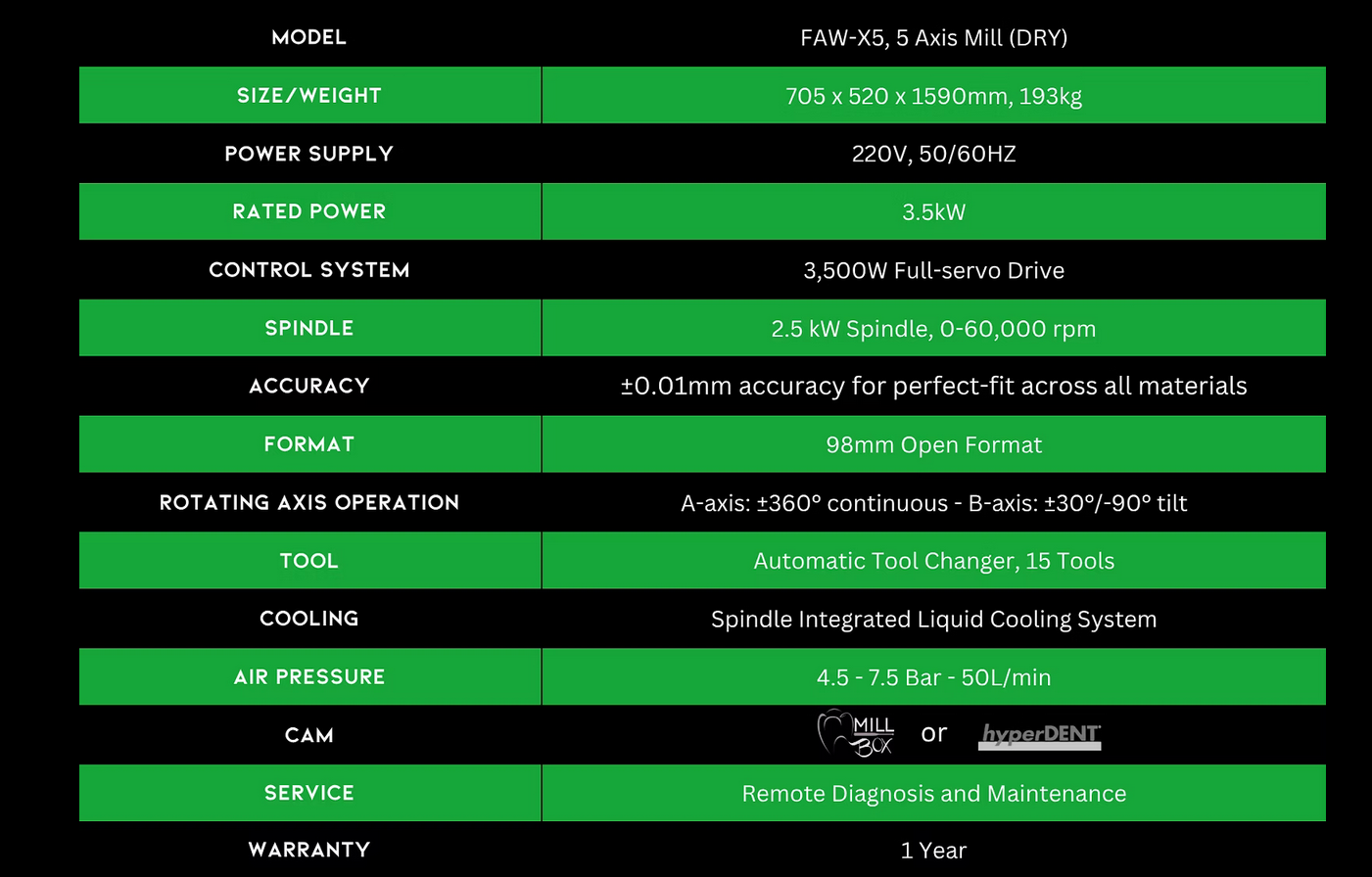 The Zirkonite FAW X-5 (DRY) was engineered for speed and precision in full-arch milling. Capable of producing a full arch in just 2.5 hours, it accelerates workflows without comprimizing accuracy. With 5-axis simultaneous linkage, automatic tool changing, and internet-enabled remote diagnostics, the FAW X-5 delivers reliable performance focused on zirconia and PMMA restorations.