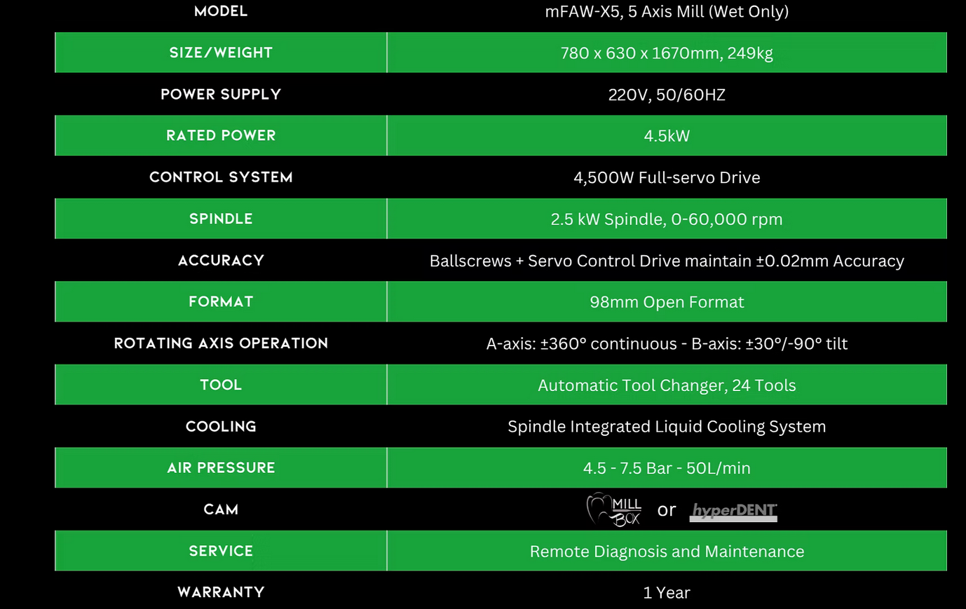 The Zirkonite mFAW-5X is a next-generation wet milling system built for precision, speed, and extended titanium workflows. With a 4,500W servo drive, 24-tool changer, and integrated cooling, it delivers uninterrupted performance during long production runs. Its advanced axis articulation, ±0.02 mm accuracy, and remote diagnostics ensure consistent results across crowns, veneers, bridges, and full metal frameworks.